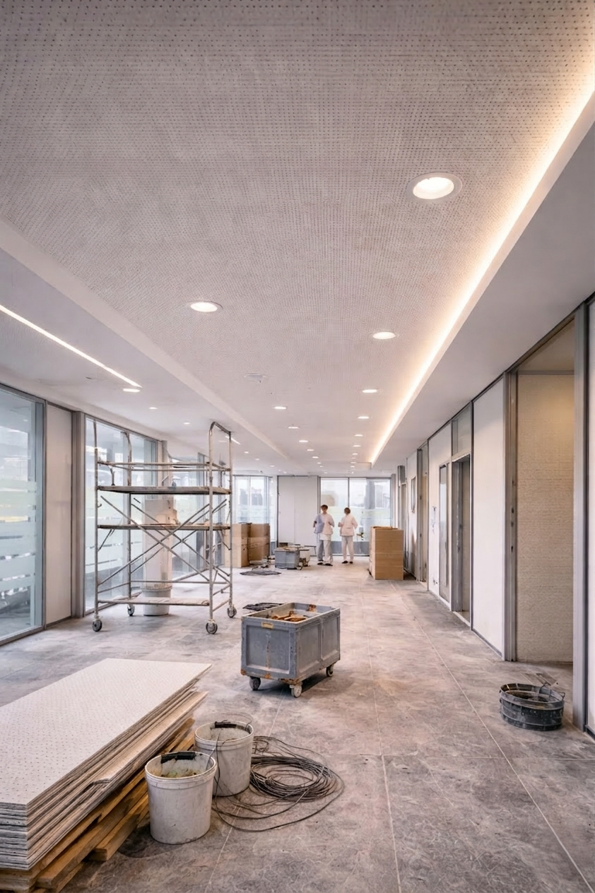 PROJECT CONSTRUCTION provides premium acoustical and drywall ceiling solutions for offices, hotels, retail outlets, and industrial facilities. Our ceiling systems combine aesthetic design, superior acoustic performance, and structural reliability, tailored to meet the demanding standards of modern commercial interiors.